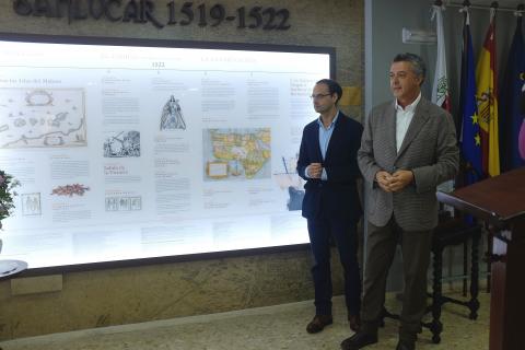 El alcalde de Sanlúcar, Víctor Mora, junto al presidente del Círculo de Artesanos, Enrique J. Román, presentó ayer la exposición historiográfica “Cronografía de la Primera Vuelta al Mundo de Magallanes y Elcano”, en el Salón del Círculo de Artesanos.